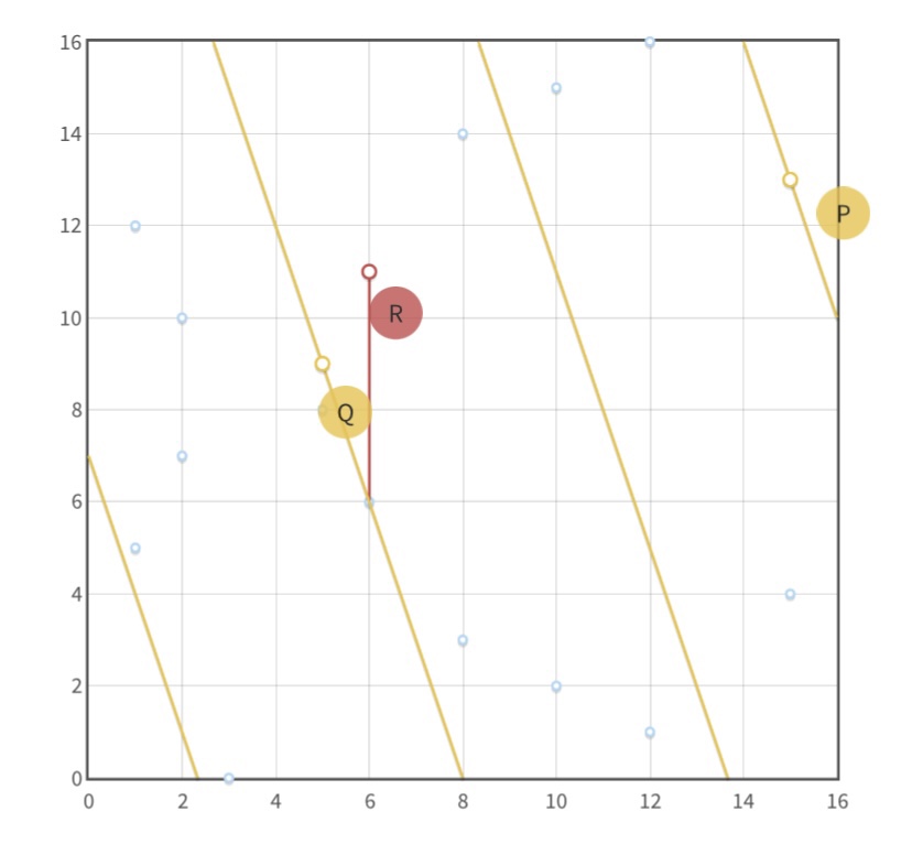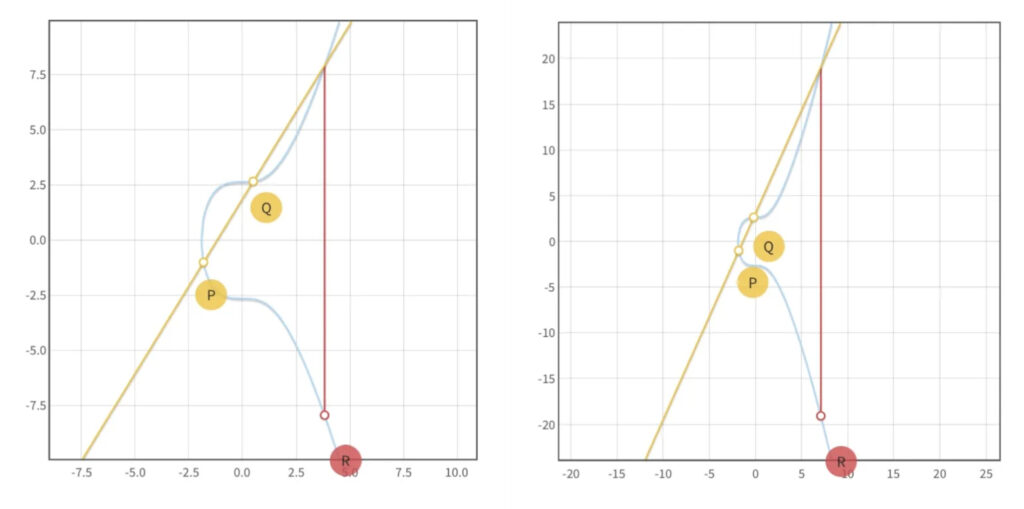 Más en concreto, lo que nos concierne es una operación que se realiza con estas curvas y que se conoce como suma de puntos. Esta operación toma dos puntos de la curva, $P = (x_P, y_P)$ y $Q = (x_Q, y_Q)$, y obtiene un tercer punto de la curva $R = (x_R, y_R)$.