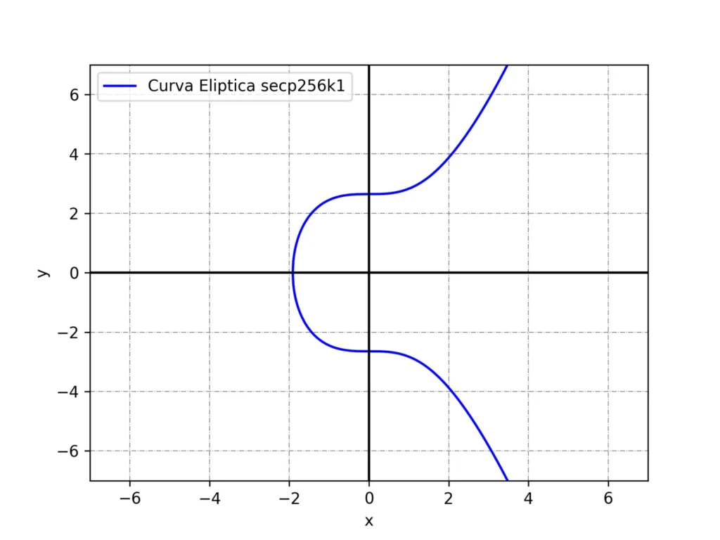 Por ejemplo, la curva elíptica usada en Bitcoin y Ethereum, con $a = 0$ y $b = 7$, se ve de la siguiente forma en el plano.