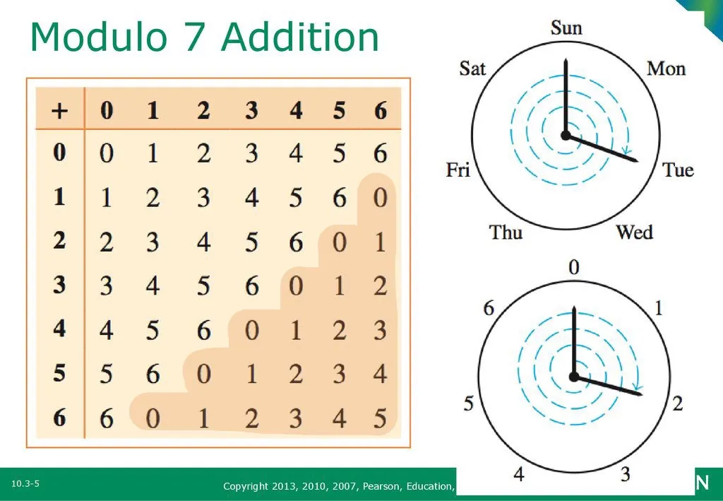 En el ejemplo del Campo Finito de orden $7$, que consiste en los números $\{0, 1, …, 6\}$, fijémonos que al sumar 5 + 2 nos salimos del rango! Para mantenernos en el rango siempre, en los cálculos del Campo Finito usamos aritmética modular, también llamada aritmética de reloj.