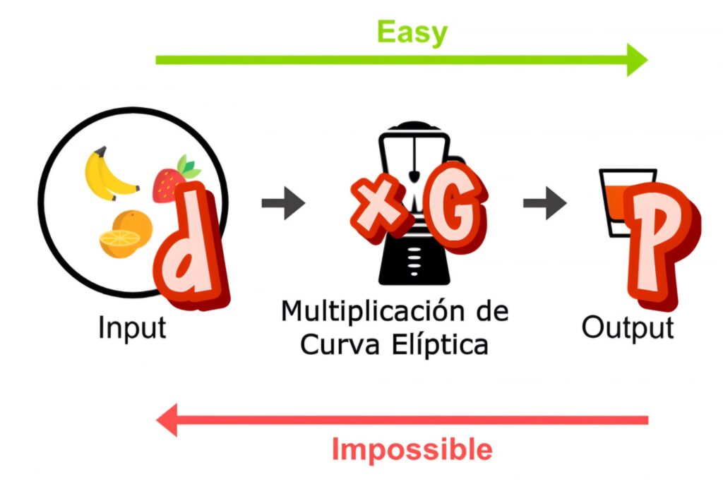Como ya hemos adelantado antes, el número $d$ es la clave privada mientras que el punto $P = d \times G$ es la clave pública. Gracias a nuestra función unidireccional es imposible calcular la clave privada de nadie a partir de su clave pública.