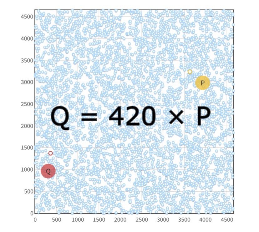 Pero en la práctica el orden del Campo Finito no es de 7 ni de 17, sino de un número de 77 dígitos. Y una curva elíptica en un Campo Finito tan grande estará conformada por muchos puntos — que satisfacen su ecuación.