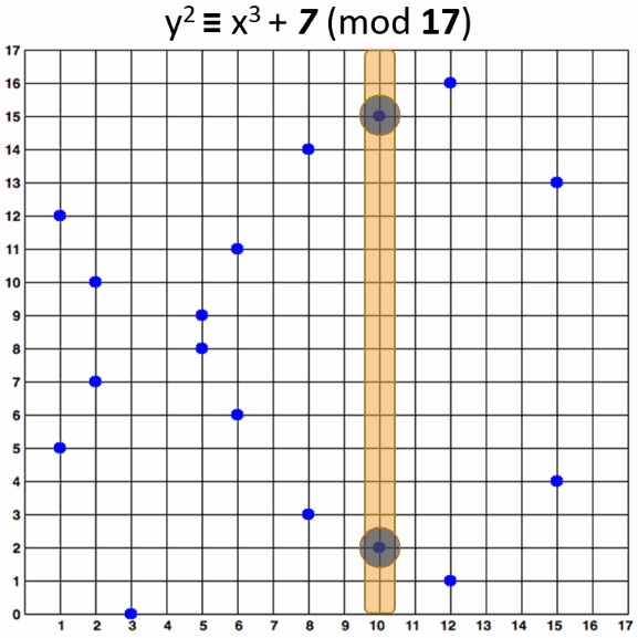 Por lo tanto, si tenemos un punto de la curva $(x, y)$, también tendremos un punto $(x, p -y)$. Esto provoca que los puntos se vean reflejados como en un espejo. La única excepción es cuando $y = 0$, ya que $p – 0 \mod p = 0$ (por lo tanto no es una coordenada $y$ distinta).